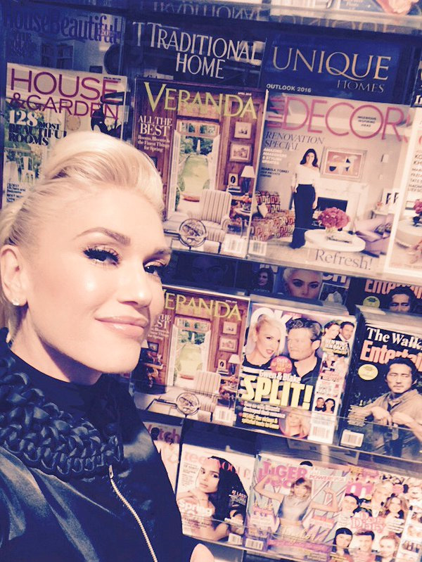 Após posar para uma foto, com a capa da revista falando de sua separação, ao fundo, Gwen compartilhou outra imagem, mostrando um cartão de acesso total à nova turnê do namorado.